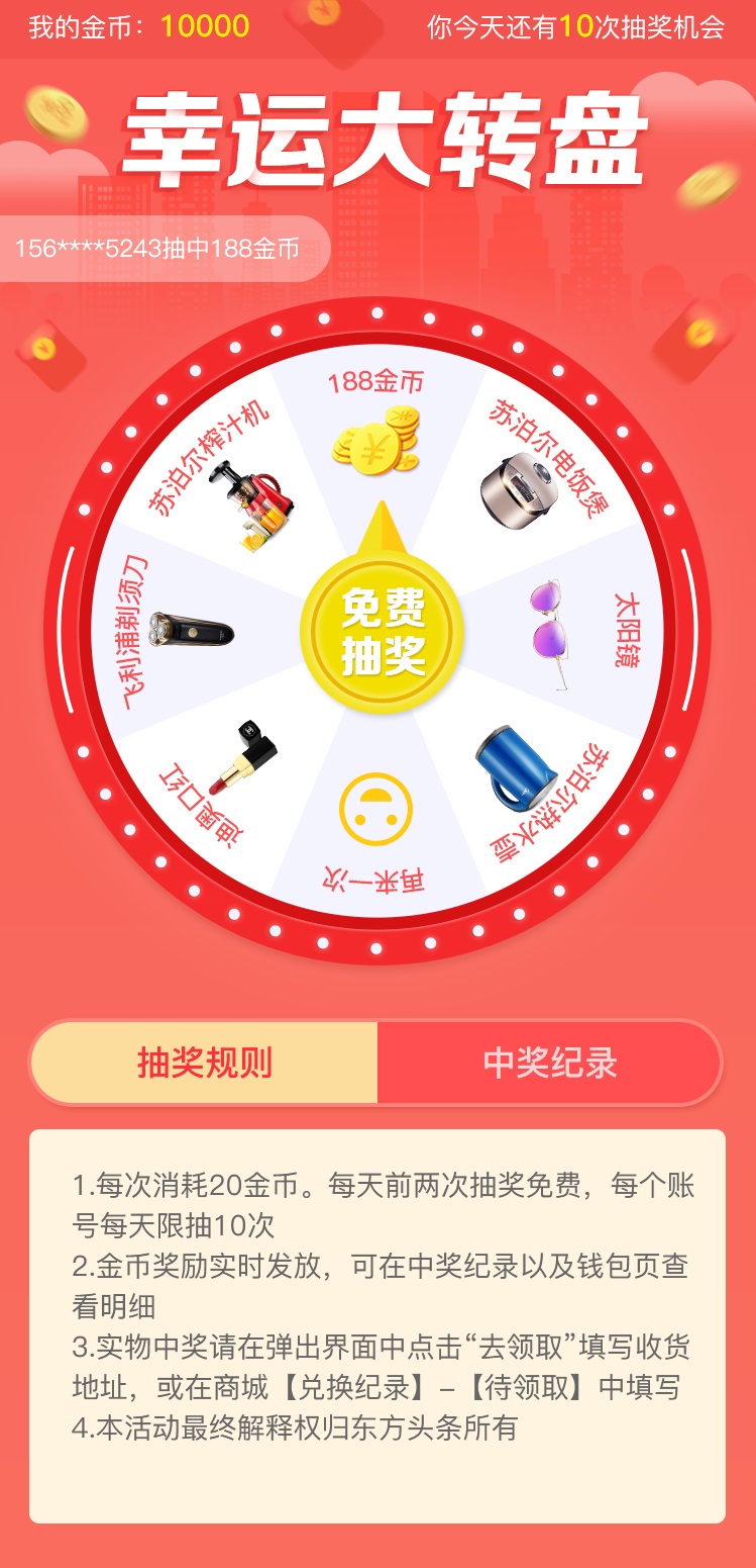 用戶在東方頭條平臺,通過閱讀、評論、分享內容或邀請好友獲取的金幣,均可參與“幸運大轉盤”抽獎活動,每消耗20枚金幣可兌換一次抽獎機會,月餅禮盒、陽澄湖大閘蟹及干紅葡萄酒等好禮繽紛上場。