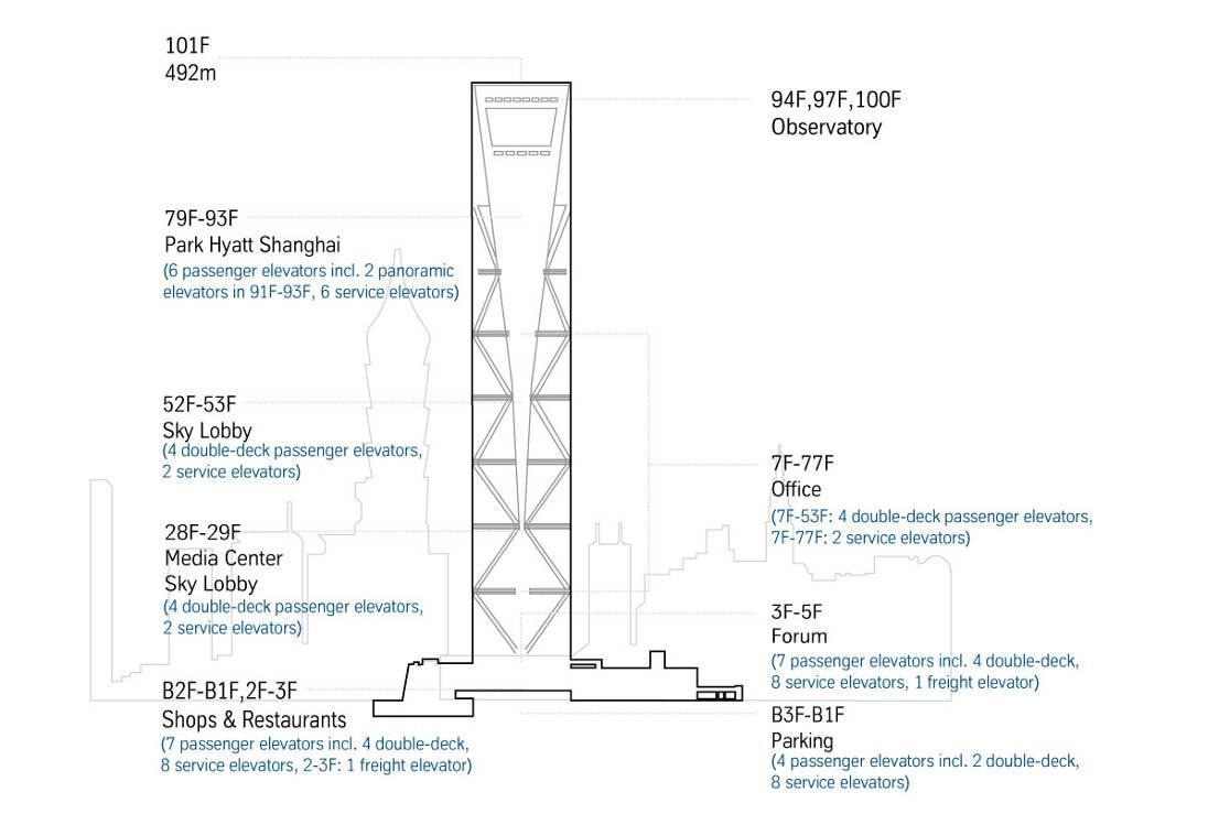 蒂森克虜伯電梯為上海環(huán)球金融中心提供了總計44臺電梯,包括15臺客梯(含4臺雙層轎廂電梯),28臺服務(wù)梯和一臺貨梯。這些電梯為這一摩天大樓提供了高效的乘客載送服務(wù),使人們能迅速到達(dá)大廈內(nèi)的各類設(shè)施,包括賓館、餐廳、會議中心、辦公室及停車場,體現(xiàn)了蒂森克虜伯電梯一貫的經(jīng)營方針:創(chuàng)新的技術(shù)、一流的品質(zhì)和顧客至上的理念。其在雙層轎廂電梯和觀光梯上表現(xiàn)得尤為淋漓盡致。