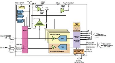 ADAS1000 的其它主要特性和優(yōu)勢包括:直流耦合通道方案具有簡化輸入切換、增加功能、降低功耗和獨特的后處理優(yōu)勢;5個 ECG 電極測量的工作功耗僅19mW,可以方便地禁用任何不用的通道或特性,使一個導聯(lián)的較低功耗僅11mW;低噪聲性能(0.05 Hz至150 Hz范圍內10 µV峰峰值)支持終端設備監(jiān)管標準;提供不同的數(shù)據幀速率(2kHz、16kHz、128kHz),較大程度地簡化數(shù)據采集任務;能夠簡化整體設計,去除許多分立器件,并縮減系統(tǒng)整體尺寸、降低功耗、縮短開發(fā)時間。該器件還集成了起搏器脈搏檢測和呼吸測量功能,這些特性對于高性能 ECG 系統(tǒng)至關重要。