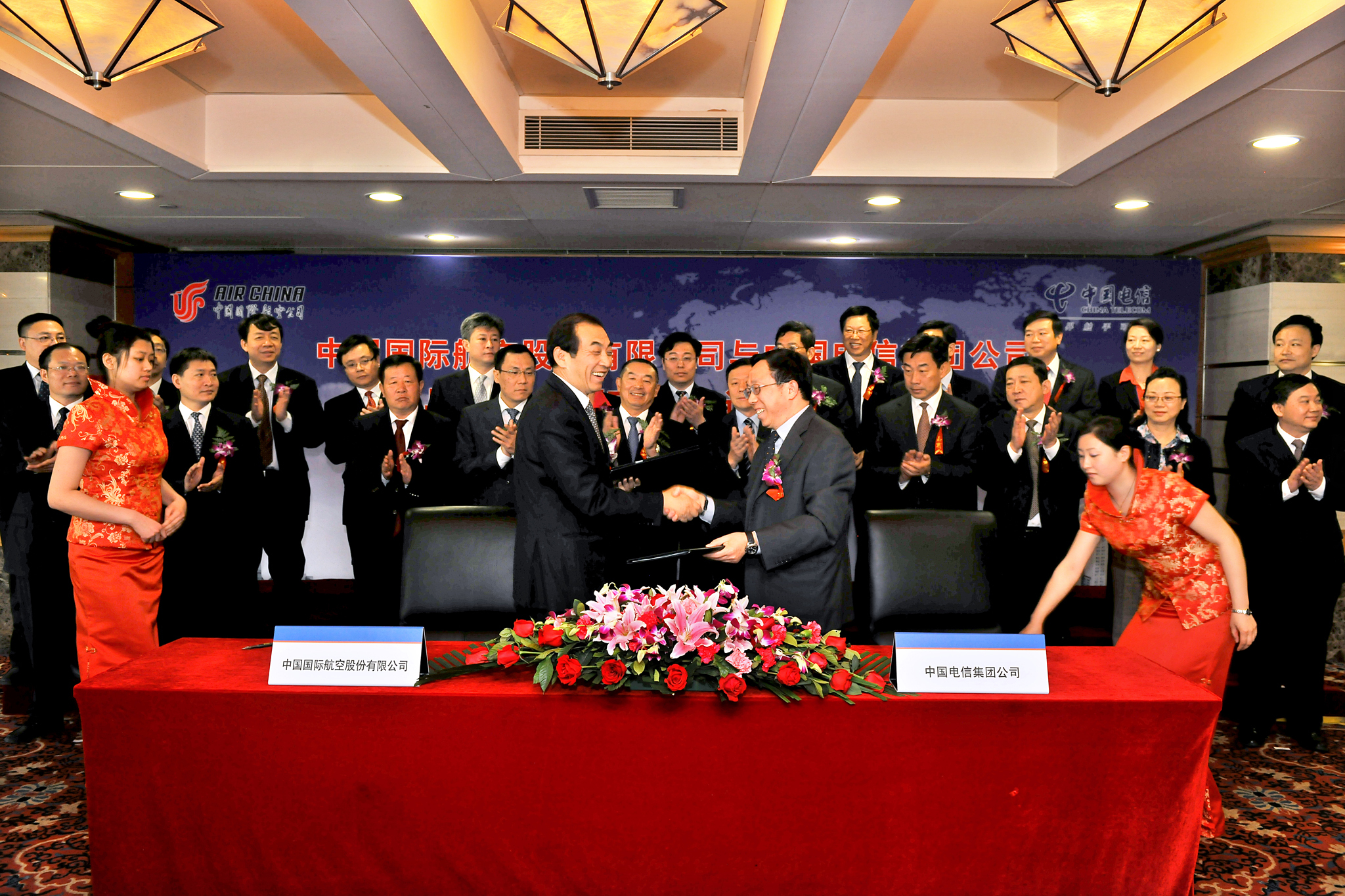 中航集團(tuán)黨組成員、中國國航總裁蔡劍江、中航集團(tuán)副總經(jīng)理孫玉德、中國國航副總裁賀利、王明遠(yuǎn)和中國電信集團(tuán)公司副總經(jīng)理孫康敏等也出席了簽約儀式。中國國航副總裁賀利、中國電信副總經(jīng)理孫康敏代表雙方在協(xié)議上簽字。