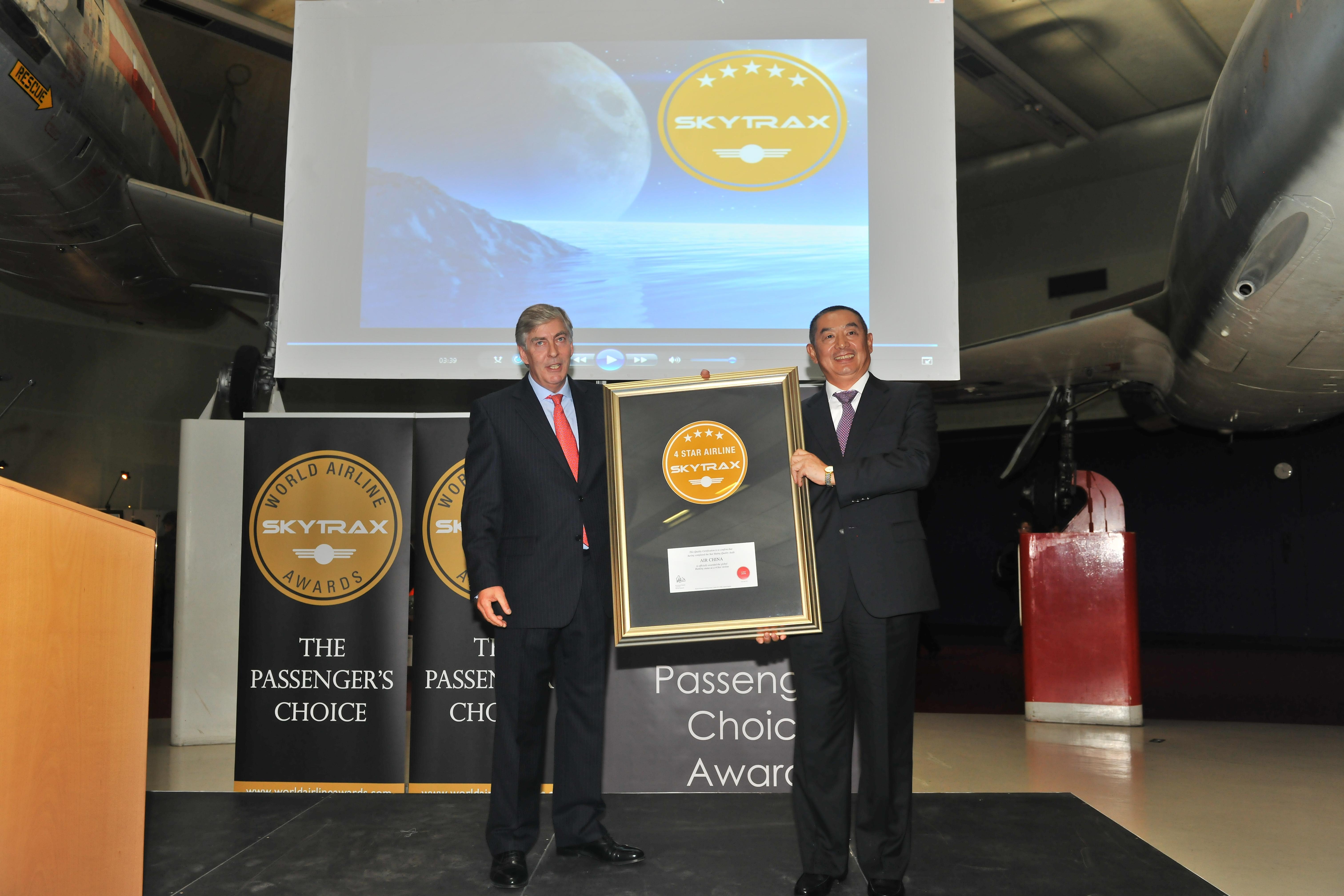 北京2011年6月24日電 /美通社亞洲/ -- 6月22日,在巴黎航展期間,中國國航獲得國際權威服務評級機構 SKYTRAX 的四星級航空公司認證。SKYTRAX 對國航的服務審計涉及17大項的635個小項。目前,國航運營覆蓋31個國家和地區的280多條航線,保障近400架運力,每天始發航班1400多架次,國內外營業部和保障機構近300百個,要在全流程服務的主要指標上達到四星級標準,需付出超出通常規模的艱苦努力。圖為中航集團總經理、國航董事長孔棟接受 SKYTRAX 頒證。