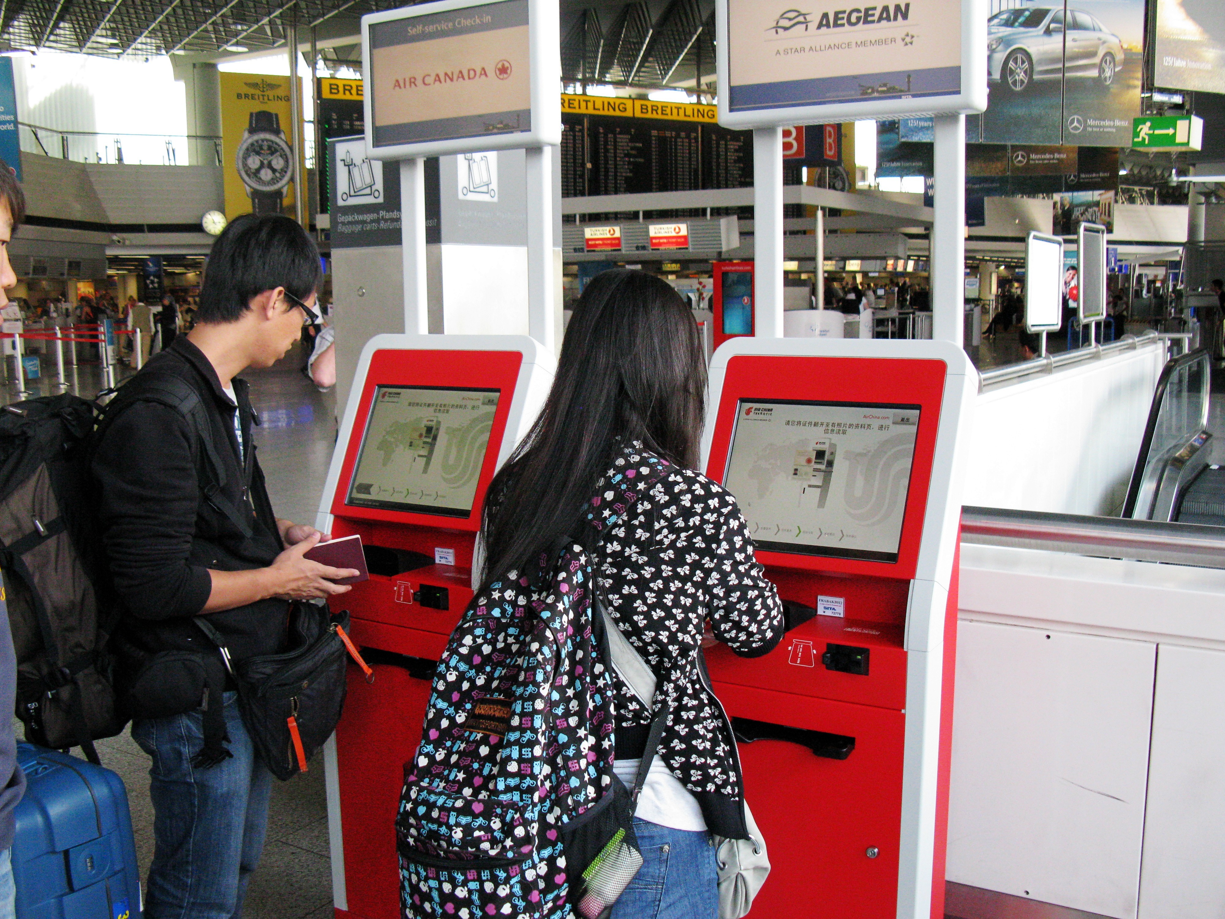 國航依據國際航協 IATA 的行業標準,以國航整體發展戰略為指導,一直致力于國航自助服務項目的發展與推廣。2011年是國航服務年,為了創建國航特色化的自助服務機制,給更多旅客創造獨特的服務體驗。暨2010年東京成田和香港國際機場成功推出機場自助乘機登記服務后,2011年8月31日,國航又在德國法蘭克福機場成功推出機場自助乘機登記服務。此次國航在德國法蘭克福國際機場開通的自助乘機登記系統操作頁面美觀,功能完善,支持聯程航班、多人辦理,流程清晰。支持中、英、繁體中文、德語言版本。旅客可以進行自行選擇座位,累積國航知音里程、獲取登機牌等一系列操作。完成辦理后可持登機牌直接通過安檢后登機,無須再耗費在人工柜臺排隊等待服務的時間,簡化了旅客的出行手續,為旅客提供了便捷的服務。