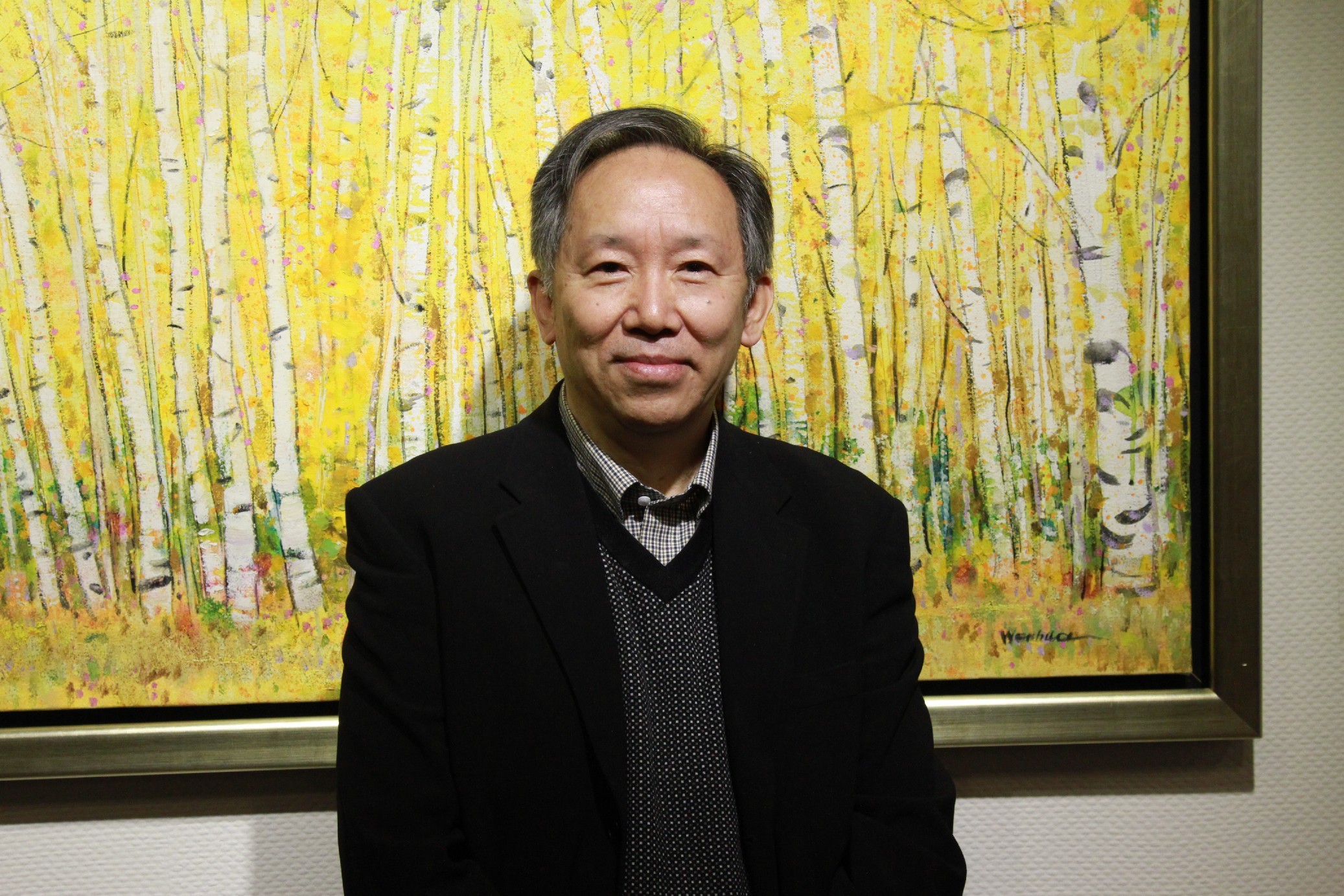 陳丹青、徐文華夫婦及美麗道董事長沈桂林在畫廊合影