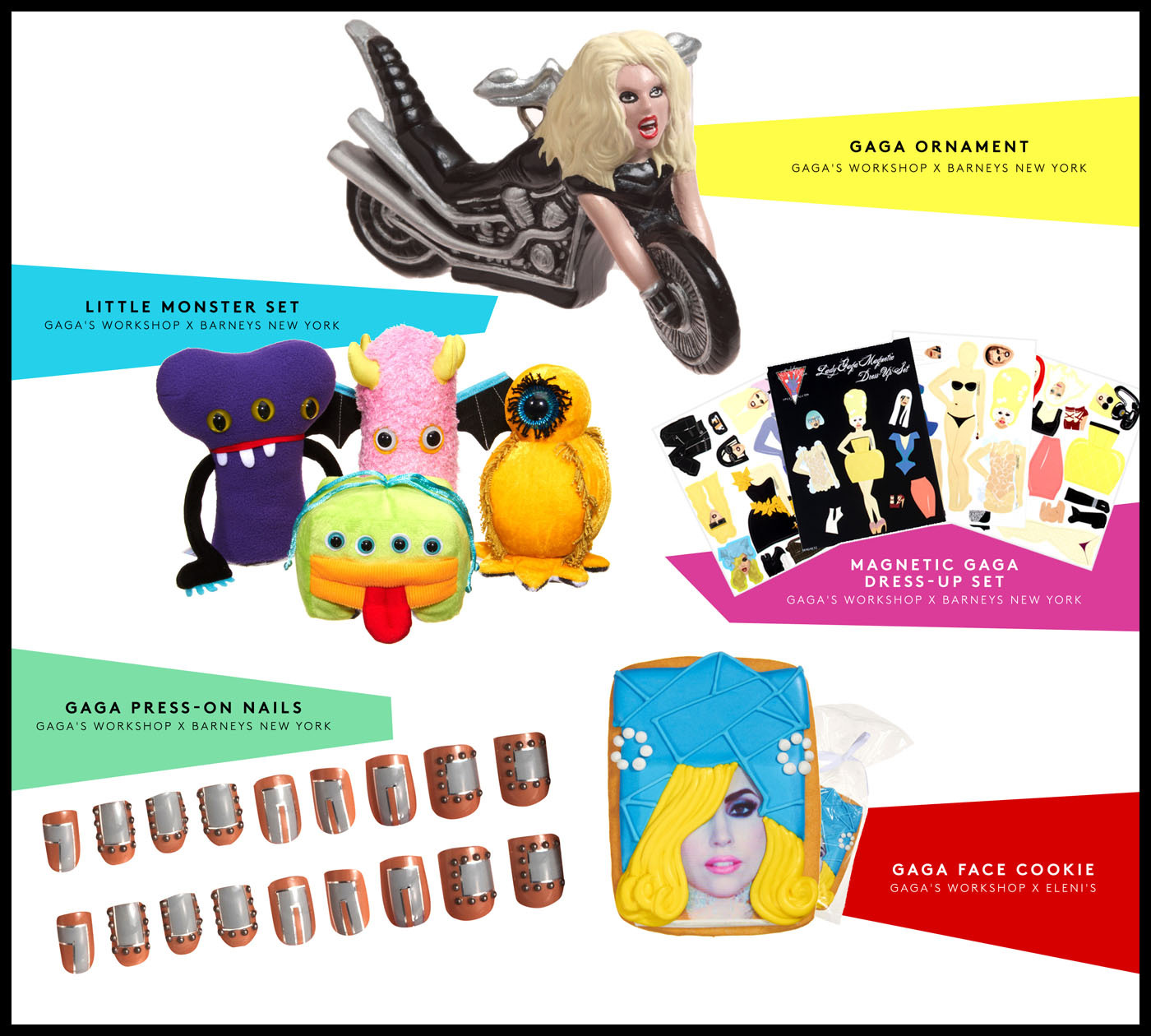 作為一個多方面的慶祝活動,GAGA'S WORKSHOP 包括:經過巧妙改造的零售環境、假日櫥窗、專門的 Gaga 互動網站以及 Lady Gaga 在 Nicola Formichetti 的創意指導下與 assume vivid astro focus (avaf) 的藝術家 Eli Sudbrack 和 Christophe Hamaide Pierson 聯手設計,并與巴尼斯創意總監 Dennis Freedman 合作完成的獨家限量版產品。