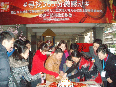 網友可以關注“@社區暖洋洋”,2012年1月5日起至20日期間,分享社區或社會上個人或家庭感人的故事。365個真實、感人、關注度高的微感動故事的主人公將贏得沃爾瑪代表網友送上的溫暖年貨。他們平凡而偉大的草根公益之愛將使龍年的春節充滿溫暖。