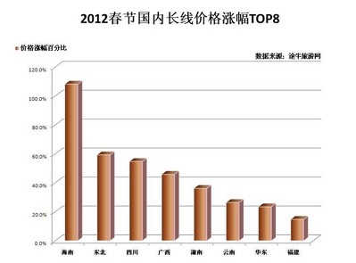 國內游方面,華北、海南、四川等熱門方向漲幅也不容小覷,如上海出發(fā)至四川方向的雙飛6日線路,全年平均價格在2500元左右,春節(jié)期間價格在4000元左右;上海至華北方向的春節(jié)價格漲幅也在1000-2000元不等?!敖衲甏汗?jié)上海市民出境游相對明顯,去往海南方向的人數(shù)占比較春節(jié)前倒是略有下降,這與上海市民較為成熟的出游觀念是分不開的,錯峰出游,避開熱門方向的最熱時段,能夠更好地享受旅游目的地的服務和風景,”途牛旅游網工作人員建議市民在選擇旅游目的地時,如有條件盡量避開“人潮洶涌”的過熱方向。