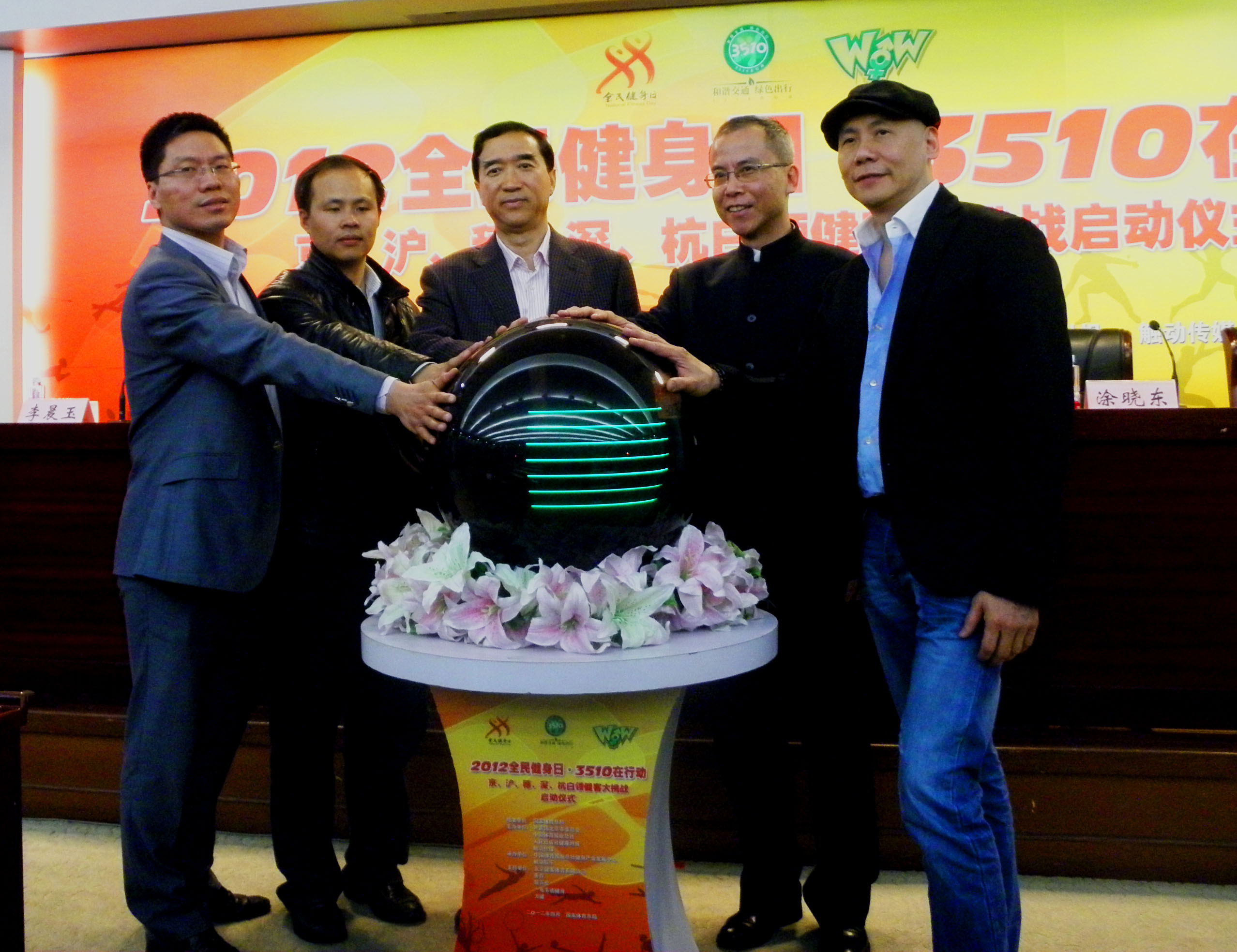 2012“WOW男WOW女”健康活動啟動儀式:(從右到左)觸動傳媒創始人及行政主席馮暉中,中國體育報業總社社長涂曉東,國家體育總局群體司司長盛志國,共青團北京市委員會社會工作部部長龔波,人民日報健康時報總編輯助理李晨玉