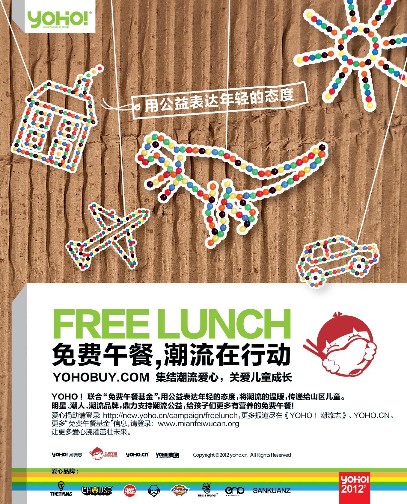 北京2012年6月15日電 /美通社亞洲/ -- 2012年6月,內地最具年輕人影響力的傳媒品牌YOHO!與“免費午餐基金”聯合開展“免費午餐,潮流在行動”潮流公益慈善活動,在YOHO!有貨(www.yohobuy.com )進行公益義賣,所有潮流義賣款項交由“免費午餐基金”為貧困山區兒童提供營養午餐,保障孩子們的健康成長。