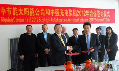南京2012年6月15日電 /美通社亞洲/ -- 全球領(lǐng)先的一站式太陽能電力解決方案提供商 -- 中盛光電集團(tuán)ET Solar Group (下稱“ET”、“中盛光電”或“中盛”) 日前宣布,將聯(lián)合中節(jié)能太陽能科技有限公司(下稱“中節(jié)能太陽能”)計(jì)劃于今年8月份在德國合資成立新能源工程技術(shù)公司(下稱“合資公司“)。