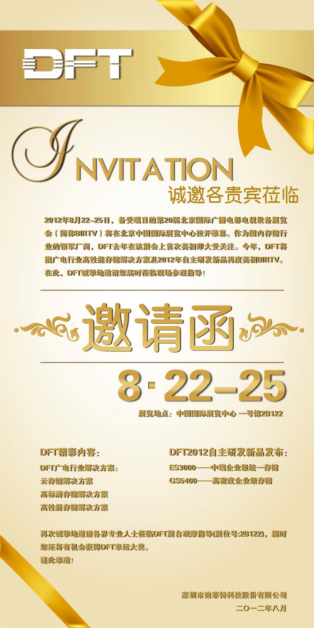 深圳2012年8月20日電 /美通社亞洲/ -- 2012年8月22-25日,備受矚目的第20屆北京國(guó)際廣播電影電視設(shè)備展覽會(huì)(簡(jiǎn)稱BIRTV)將在北京中國(guó)國(guó)際展覽中心拉開(kāi)帷幕。作為國(guó)內(nèi)存儲(chǔ)行業(yè)的領(lǐng)軍廠商,DFT去年在該展會(huì)上首次亮相即大受關(guān)注。今年,DFT將攜廣電行業(yè)高性能存儲(chǔ)解決方案及2012年自主研發(fā)新品再度亮相BIRTV。在此,DFT誠(chéng)摯地邀請(qǐng)您屆時(shí)蒞臨現(xiàn)場(chǎng)參觀指導(dǎo)!