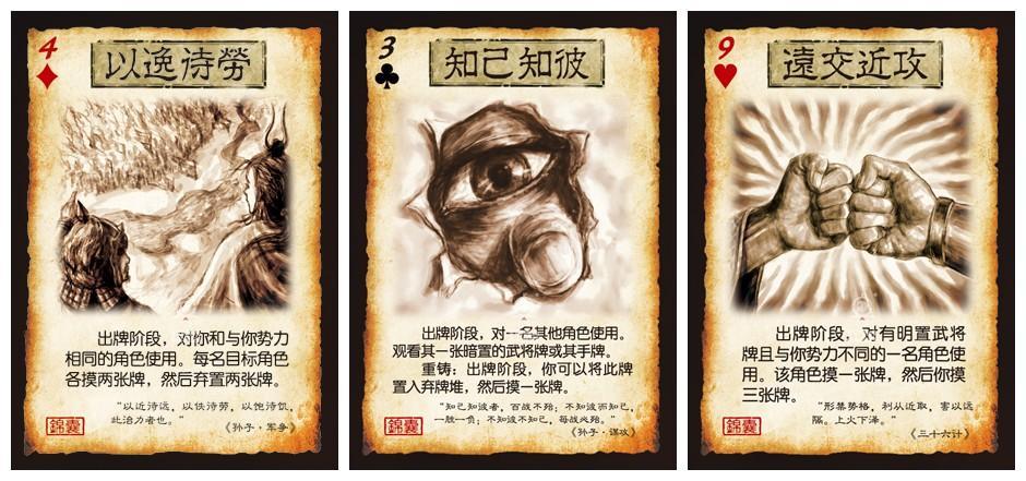 由此可見,《三國殺·國戰》以桌游的方式演繹了在一場多方勢力混雜的戰爭。用【以逸待勞】保存、提高自己的實力。用【知己知彼】一探身邊的神秘人物是敵是友、甚至摸清底細。用【遠交近攻】團結身邊的敵人,把他的優勢變成自己的武器,去消滅那些容易消滅的敵人。而每一支錦囊何時出現、如何使用的安排、謀劃,會具有什么樣的威力、效果,就要看玩家的運籌帷幄了。