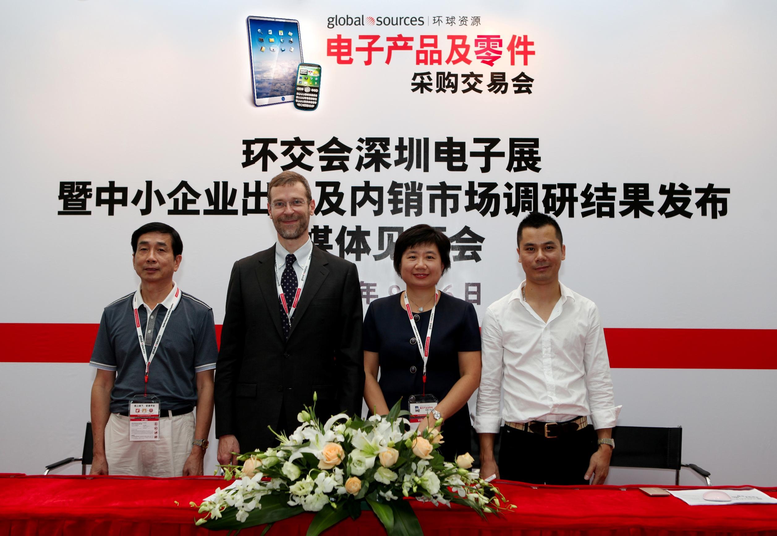 環球資源企業事務總裁兼《世界經理人》雜志出版人裴克為 (Craig Pepples) 先生(左二)、環球資源中國內貿發展部副總裁任麗峰女士(右二)、廣東省電子行業協會會長陳國英先生(左一)和深圳市維爾尚商貿有限公司董事長盧德曉先生(右一)在第二屆“環球電子產品及零件采購交易會” 媒體見面會上合影。