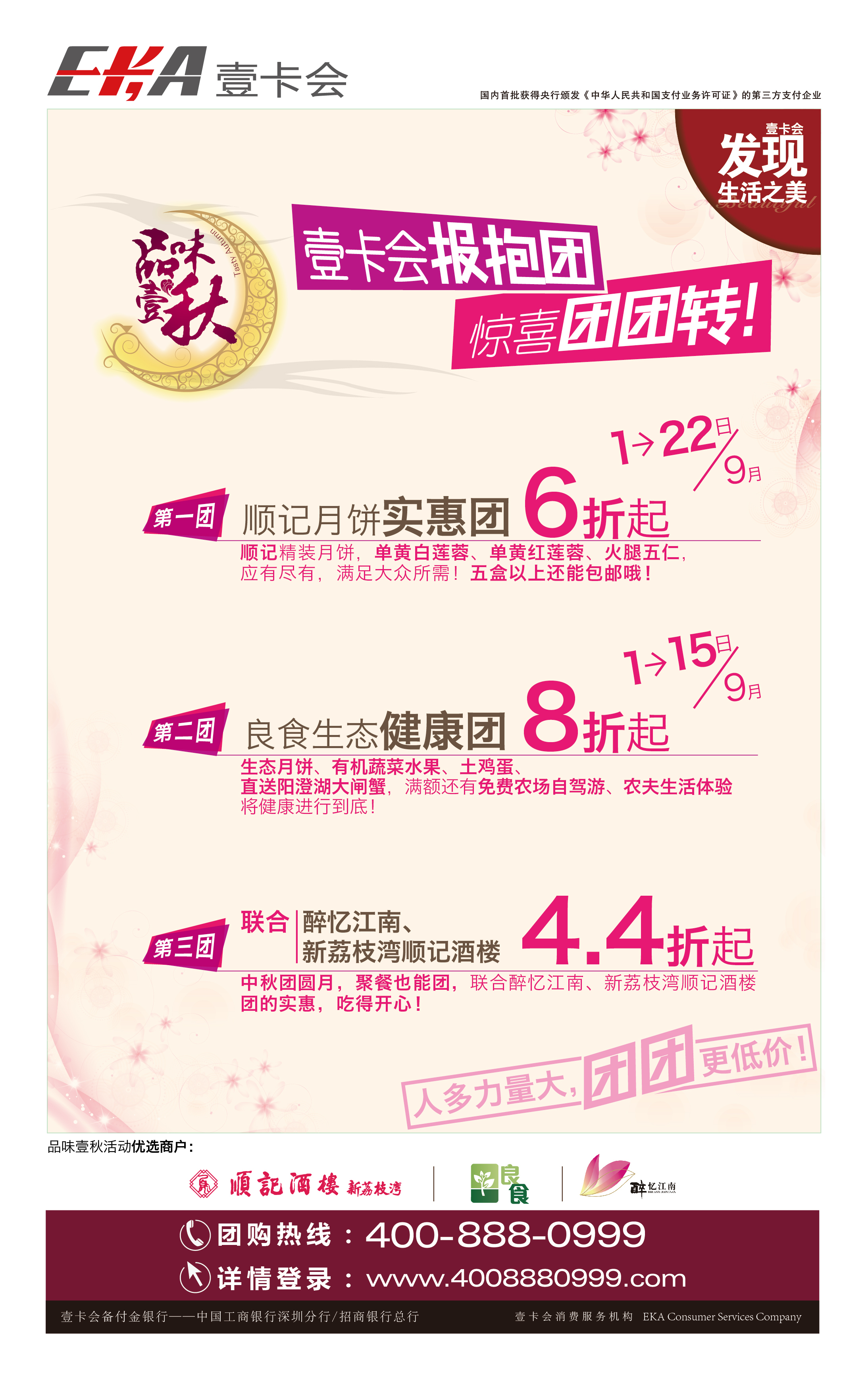 壹卡會(huì)·發(fā)現(xiàn)生活之美.品味壹秋大型團(tuán)購(gòu)活動(dòng)可接受企業(yè)或個(gè)人報(bào)團(tuán),詳詢400-888-0999或登錄www.4008880999.com進(jìn)行自助團(tuán)購(gòu)。(活動(dòng)僅限深圳地區(qū))