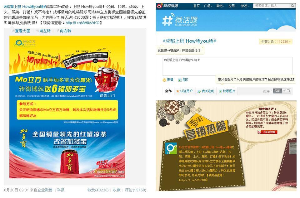 Mo立方,是由成都摩寶網絡精心打造的全新O2O移動電子商務平臺,致力于為生活類消費用戶提供本地餐飲消費、娛樂休閑類生活服務,首創“揣著手機,移動消費”新概念。Mo立方攜手加多寶的本次微博活動,隸屬國內首次O2O平臺與傳統快銷品牌合作的微博營銷,也是一次非常創新的營銷模式探索,用戶、商家皆大歡喜。本次微博活動的成功,究其原因,是主辦方成功借勢當下熱門話題——成都二環擁堵,將交通擁堵、群眾上火,與深入全國人心的“怕上火,喝加多寶”品牌理念進行了完美整合,并進行了即時的、高質量的用戶互動。