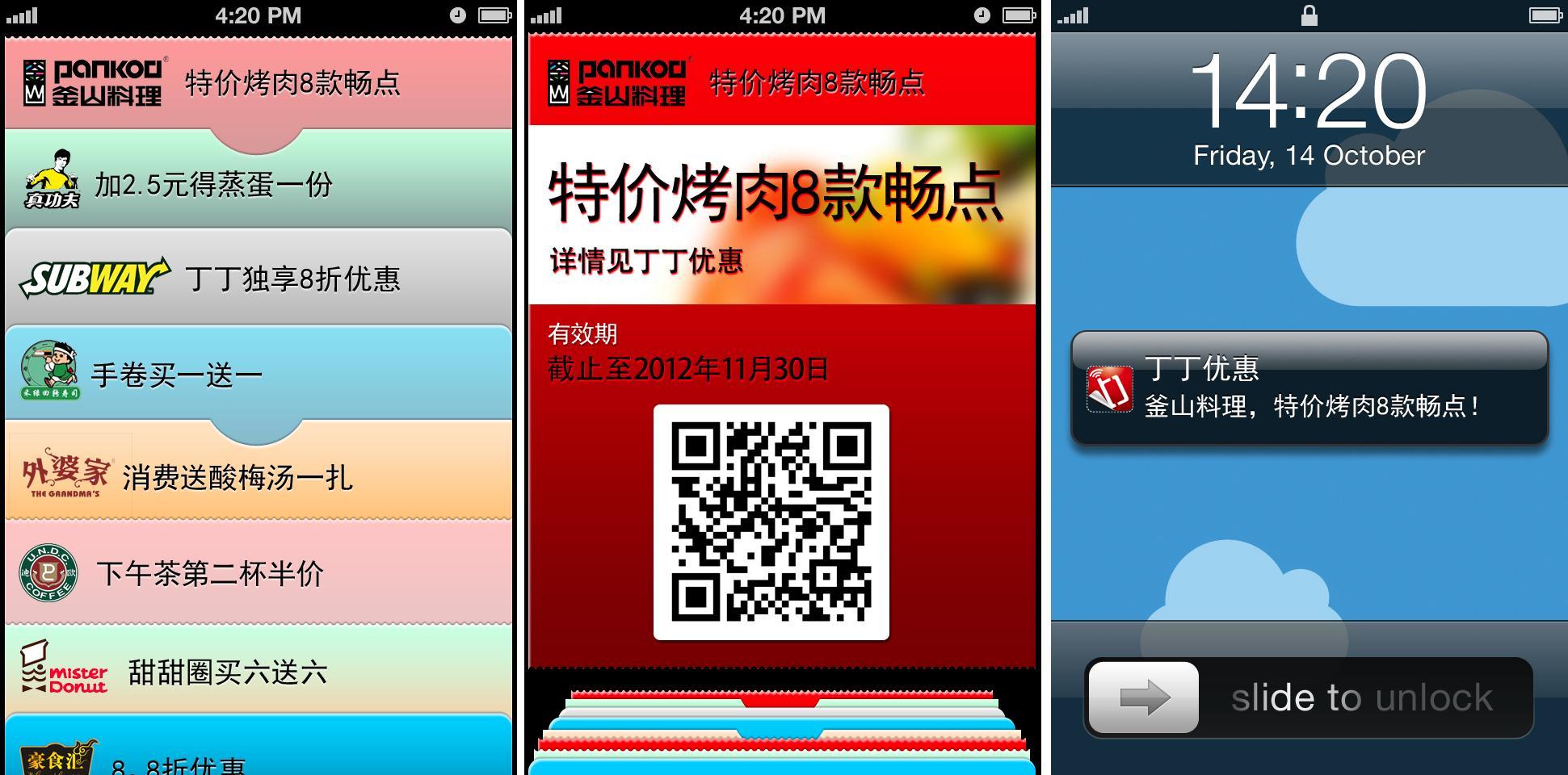 值得一提的是,丁丁優惠還將支持Passbook的“到店提醒”功能。用戶在完成收藏優惠券到Passbook的動作后,優惠券的地理位置信息也一樣被同步,一旦用戶到達所收藏優惠券商戶所在地附近時,Passbook的LBS功能將在鎖屏狀態下,溫馨地提醒用戶使用 -- 記得在消費時享受優惠。
