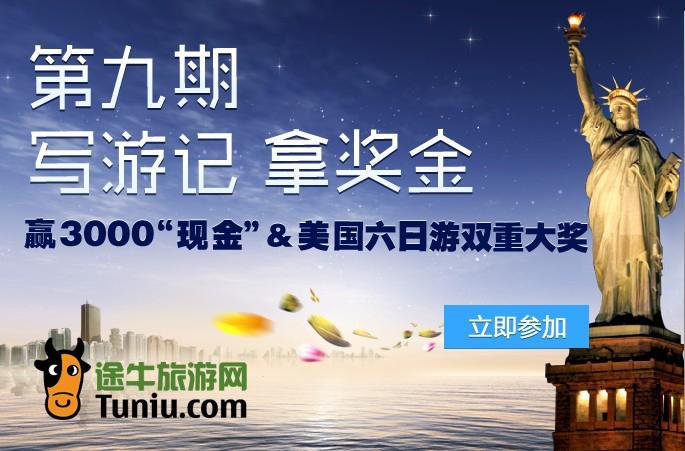 北京和上海2012年9月25日電 /美通社/ -- 途牛旅游網(wǎng)“寫游記,拿大獎”活動已經(jīng)開展到第九期。自活動開啟以來,許多旅游達人踴躍參與,參賽游記繽紛多彩,讓“圍觀”眾人不但大飽眼福,還了解到了許多實用攻略。目前,第九期寫游記正在火熱進行中,現(xiàn)在到途牛旅游網(wǎng)社區(qū)發(fā)表游記,就有機會贏得3000元“現(xiàn)金”和美國游雙重大獎。