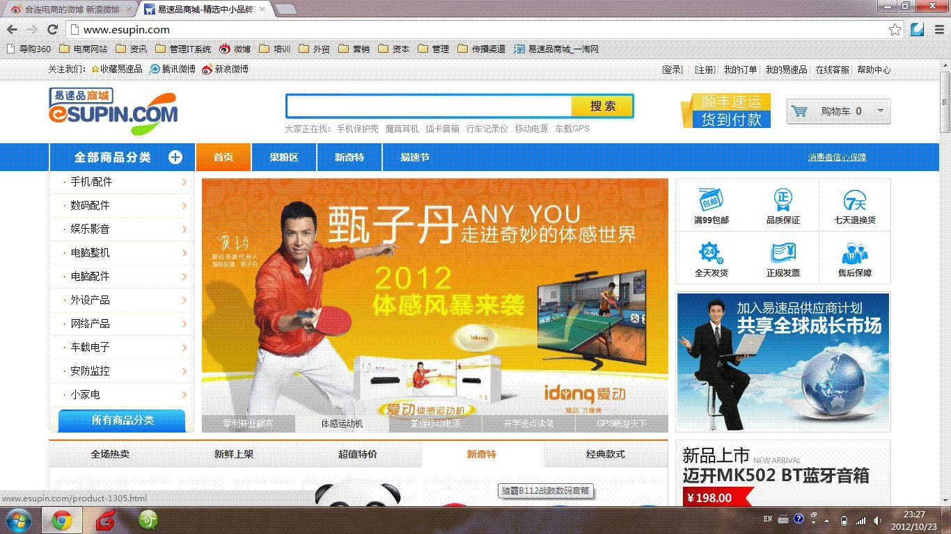 深圳2012年10月24日電 /美通社/ -- 繼義烏購之后,又一家以整合中小品牌國貨的獨立B2C商城——易速品商城(www.esupin.com)日前正式上線運營,其進入的正是京東、蘇寧、易迅等電商巨頭們爭奪最激烈的3C(電腦、手機通訊、個人消費電子)領(lǐng)域。