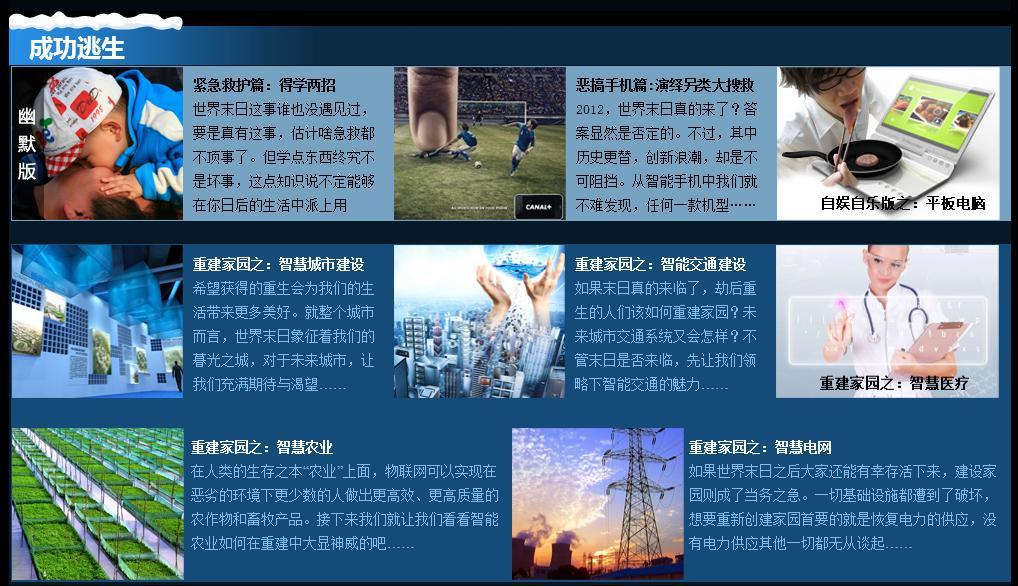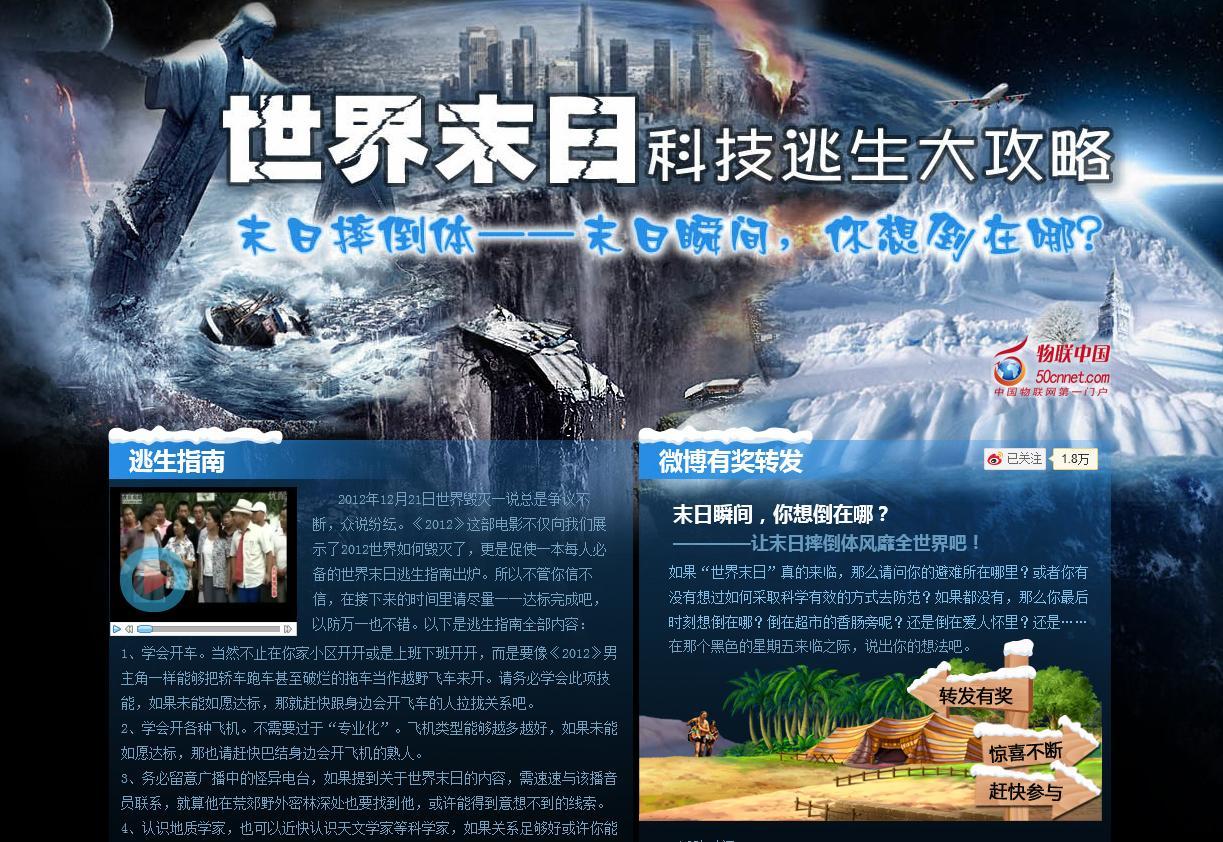 物聯中國“世界末日科技逃生大攻略”專題主要分為“逃生指南、必備清單、微博有獎轉發、制高點、避難所、諾亞方舟、成功逃生、重建家園、未發生災難、網友互動”十大版塊,內容只能以“各種搞笑”來形容。