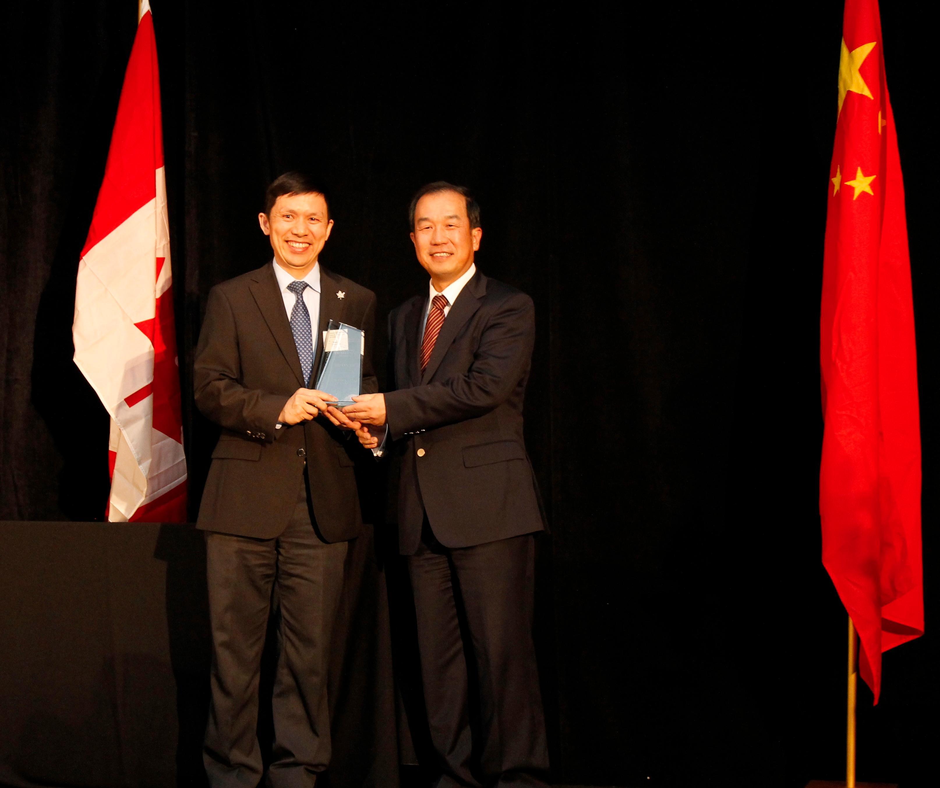 北京2012年12月24日電 /美通社/ -- 2012年11月27日,中國國際航空股份有限公司(以下簡稱“國航”)榮獲在加拿大蒙特利爾舉行的第34屆加中貿(mào)易理事會(CCBC)年會杰出企業(yè)獎 -- 銅獎,以表彰國航在提升產(chǎn)品和服務(wù),促進(jìn)中加之間人員、文化、經(jīng)貿(mào)交流和合作方面的貢獻(xiàn)。溫哥華營業(yè)部總經(jīng)理徐俊鴻代表公司在加拿大總督 David Johnston 和與會300多名中加商界嘉賓的掌聲中,從中國駐加拿大大使章君賽手上接過了2011-2012年度杰出企業(yè)獎的獎牌。