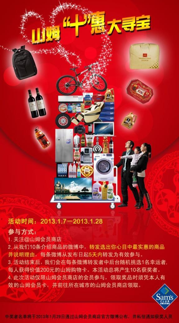 1月7日至28日,山姆會員商店官方微博@山姆會員商店將發(fā)出10條介紹商品的微博,山姆會員只需關注@山姆會員商店 ,從這10條微博中轉發(fā)選出心目中實惠的商品并說明理由,就可以參與抽獎。每條微博從發(fā)布日起5天內轉發(fā)為有效參與,活動結束后,山姆會員商店會在每條微博轉發(fā)者中后臺隨機挑選10名幸運山姆會員,每人獲得價值200元的山姆購物卡。中獎者名單將于1月29日通過@山姆會員商店公布,并私信通知獲獎人員。