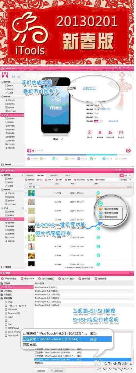 深圳2013年2月4日電 /美通社/ -- 春節快來了,四處洋溢著濃厚的過節氣氛,iOS6.1也趕上春節的浪潮乘勢發布,惹得我們內心都蠢蠢欲動了。 iTools 推出 20130131 新春正式版,全面支持最新 iOS6.1 管理和 iOS6.1 的 SHSH 備份,特色新春版界面,節日氣氛更濃郁;程序庫加倍優化,管理更高效,更有手機估值、Q-Zone分享和農歷一鍵添加等特色功能,讓你的蘋果變簡單。