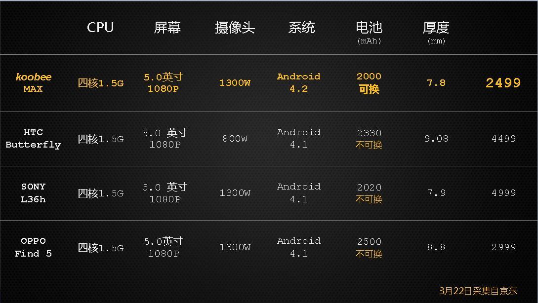 koobee 四核旗艦MAX在發布會上公布售價為2499元,京東活動預訂期間,下單立減200元,售價只需2299元。此次活動中贈送的大禮包份量也是相當的豐厚。擁有28nm四核處理器、5寸1080p屏幕、1300萬像素配置的酷比旗艦機型MAX,2299元的零售價相當具有吸引力,而這也是目前小編得知的較低價格5寸1080p四核旗艦機型,直接秒殺了傳說中性價比之王的“小米2”。而以2499元的售價來看,koobee MAX也是目前市場上在售機型中性價比較高的四核1080p手機。