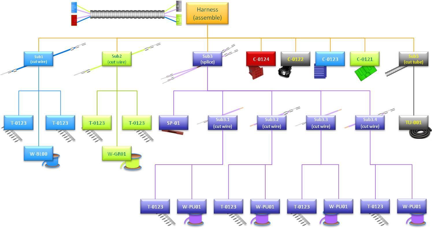 每項線束設計都可分解為一系列有序的制作步驟進行,每個步驟都會使用到組件或子組件,并產(chǎn)生新的子組件,直到線束制作完成。物料結構清單便是該分解分析的一項重要結果,它能夠反映有序過程,與那些只需要根據(jù)線束設計就可以計算出來的沒有層次結構的物料清單有著明顯的區(qū)別。圖1為簡單線束的分層原理示意圖。