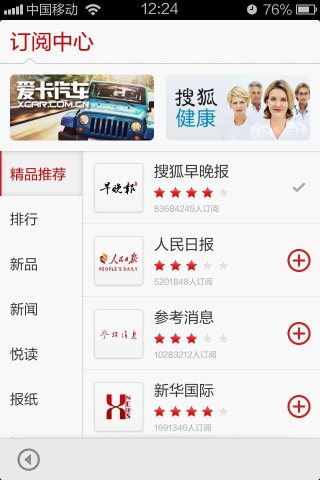北京2013年4月24日電 /美通社/ -- 搜狐今日宣布旗下移動互聯(lián)網(wǎng)產(chǎn)品搜狐新聞客戶端用戶量突破一億,成為國內(nèi)首個用戶數(shù)過億的新聞客戶端。截止于2013年4月,搜狐新聞客戶端全媒體平臺合作媒體550多家,總訂閱量突破4.5億,其中《央視財經(jīng)》、《參考消息》等媒體刊物超過千萬訂閱量,《南方周末》、《人民日報》、《意林》、《讀者》等媒體刊物超過500萬用戶訂閱量,百萬以上的訂閱刊物超過33家。