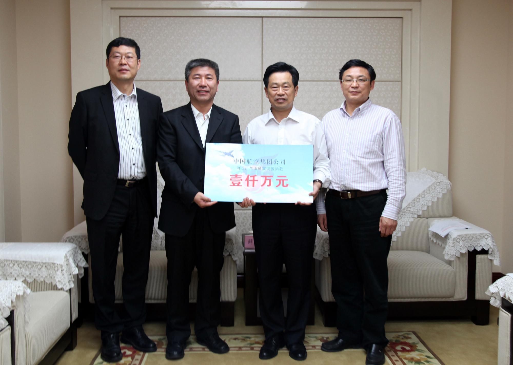 北京2013年4月27日電 /美通社/ -- 4月25日,受集團黨組的委托,集團工會主席薛亞松一行來到四川省人民政府,代表中航集團7萬干部職工向蘆山地震災區捐款1000萬元人民幣。四川省人民政府副秘書長蔡競代表省政府接受了捐款,并對中航集團和國航表示感謝,承諾將把善款用到最需要的地方。集團黨組辦公室副主任匡洪杰和國航西南分公司總經理劉鐵祥、四川省政府應急辦副主任駱西寧參加了捐贈儀式。