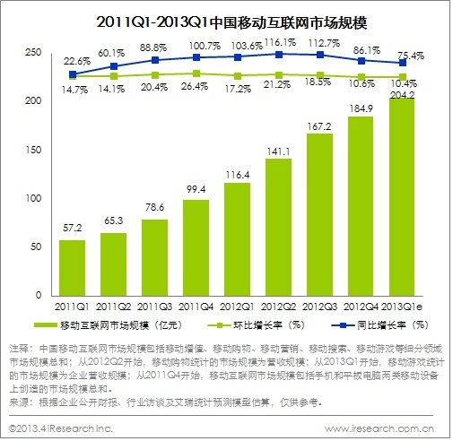 艾瑞咨詢統(tǒng)計(jì)數(shù)據(jù)顯示,2013Q1中國移動(dòng)互聯(lián)網(wǎng)市場規(guī)模為204.2億元,同比增長75.4%,環(huán)比增長10.4%。經(jīng)過過去兩年的高速增長,移動(dòng)互聯(lián)網(wǎng)在盈利模式、產(chǎn)業(yè)格局等方面進(jìn)入關(guān)鍵性的一年。