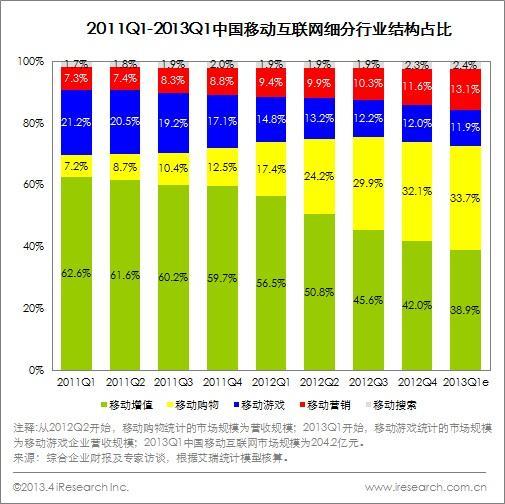 2013Q1 由于是網(wǎng)購的淡季,移動(dòng)購物在整體市場中的占比增幅較小,然而移動(dòng)購物的市場依然保持了較高增長;移動(dòng)增值雖然仍是移動(dòng)互聯(lián)網(wǎng)占比較高的細(xì)分行業(yè),但其占比持續(xù)下降,傳統(tǒng)的增值業(yè)務(wù)不斷被其他領(lǐng)域擠壓,新興增值業(yè)務(wù)體量尚小;移動(dòng)游戲增速較為平穩(wěn),在其他領(lǐng)域增速較高的背景下市場份額也處于下降趨勢;而新興的移動(dòng)搜索及移動(dòng)營銷基數(shù)較小,增速較高,占比也處于快速增長狀態(tài)。艾瑞預(yù)計(jì)未來移動(dòng)購物將成為移動(dòng)互聯(lián)網(wǎng)較大細(xì)分行業(yè)。