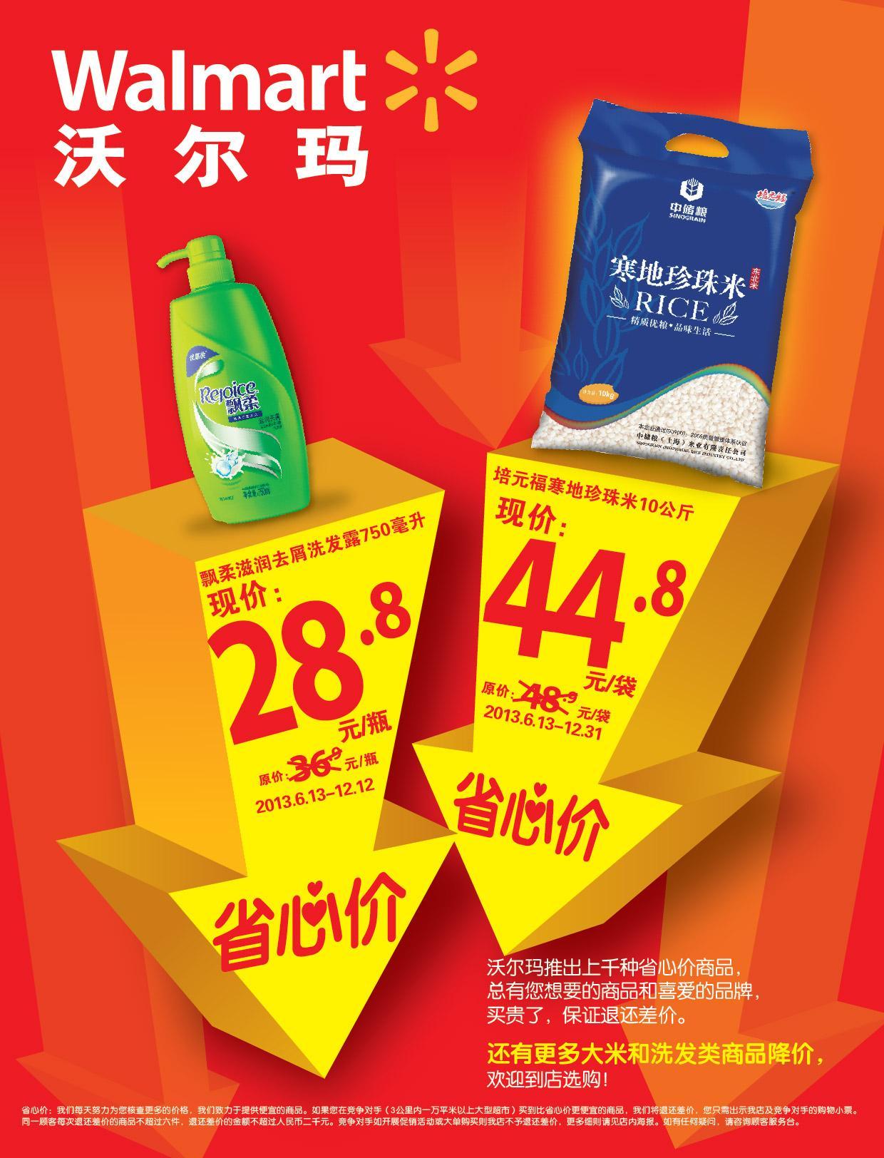 深圳2013年6月13日電 /美通社/ -- 沃爾瑪一直致力于給顧客提供低價商品,并長期推出了上千種省心價商品,滿足顧客每日所需。今天起,全國范圍的沃爾瑪購物廣場將特別推出 “省心價”商品:培元福寒地珍珠米(10公斤裝)和飄柔滋潤去屑洗發露(750毫升裝),這兩款商品的價格有效期將持續到今年12月。