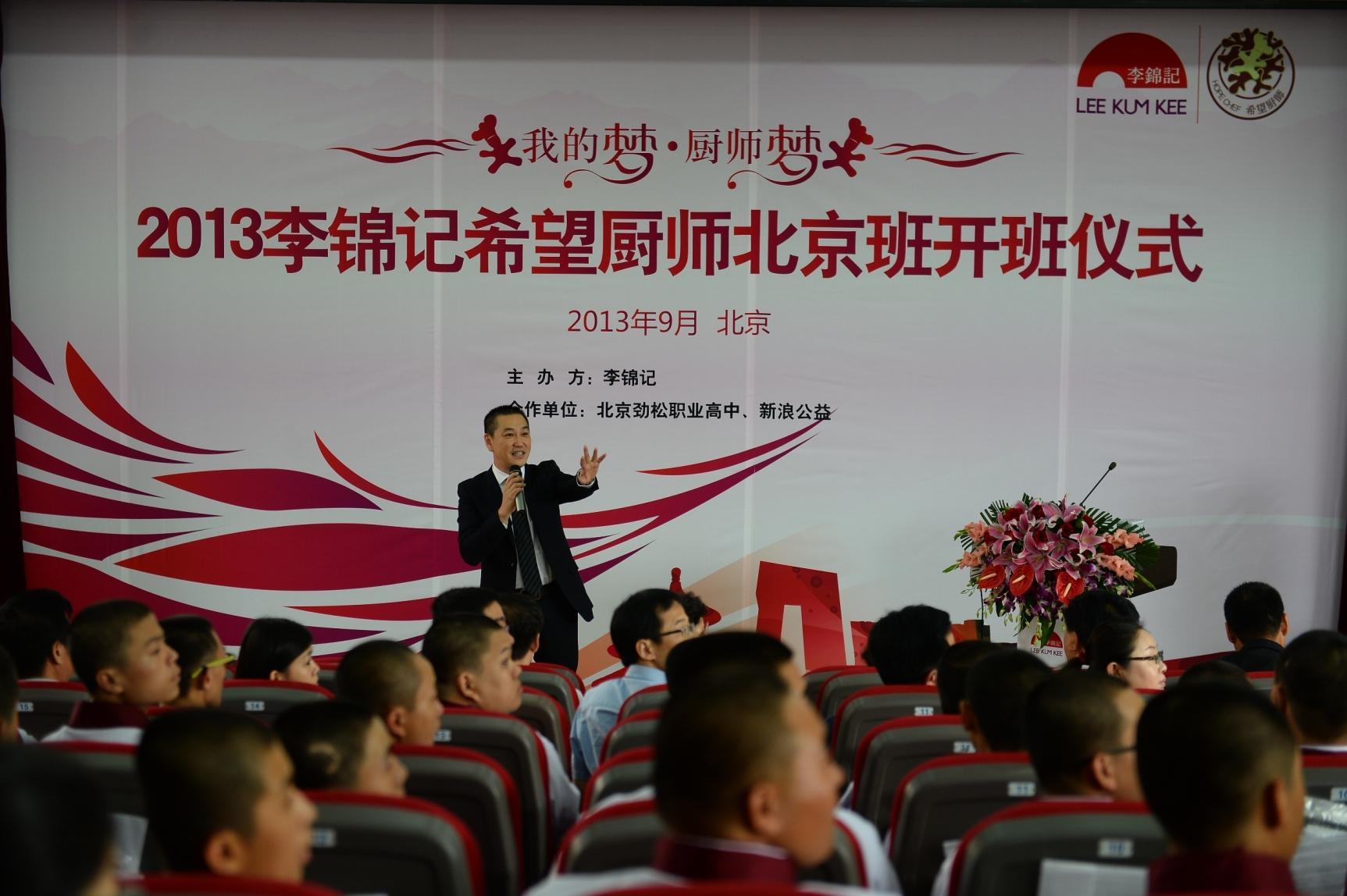 北京2013年9月6日電 /美通社/ -- 2013李錦記希望廚師北京班開班儀式在北京勁松職業高中舉行,來自貴州、甘肅、云南、黑龍江等10個省的72名寒門青年,承載著家庭與社會的希望,在這里開啟了他們的廚師夢想之旅。團中央學校部副部長杜匯良、李錦記中國總裁周志毅、新浪公益主編崔洪霞、北京勁松職業高中校長賀士榕等出席了開班儀式并致辭。