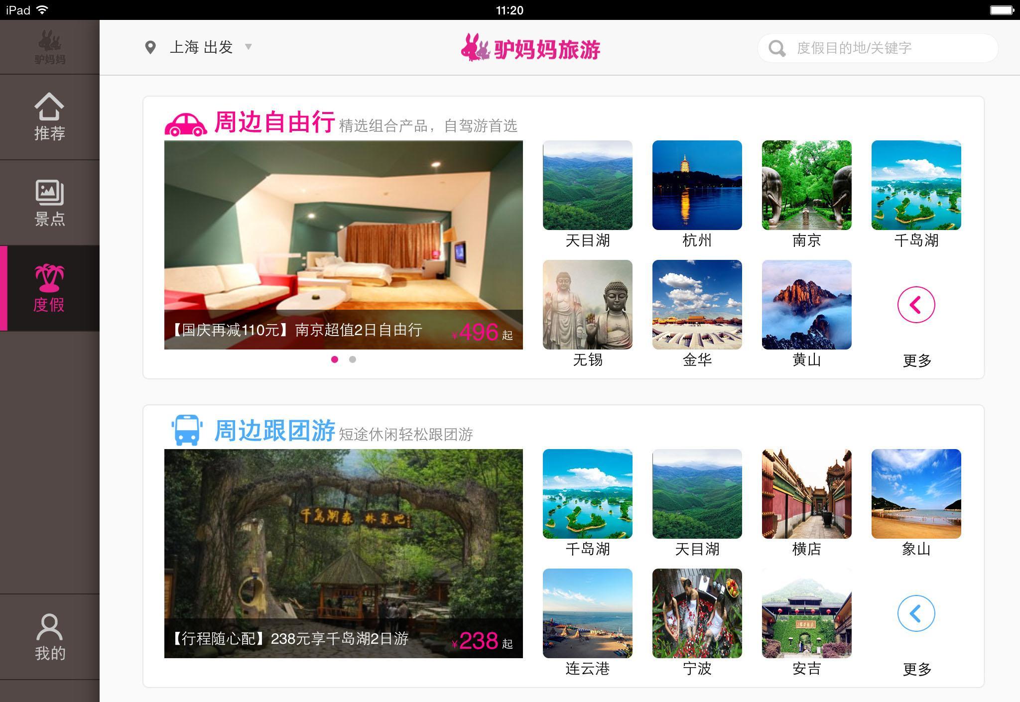 全新驢媽媽iPad版客戶端提供了基于門票、周邊自由行、周邊跟團(tuán)游、長(zhǎng)途游、出境游等多種類型產(chǎn)品的訂購服務(wù)。為方便用戶查找出游目的地,客戶端還開發(fā)了超實(shí)用的目的地搜索功能,用戶可通過頻道頁面右上方點(diǎn)選“景點(diǎn)/目的地”、“度假/目的地”,根據(jù)各自出游目的地搜索到相關(guān)產(chǎn)品進(jìn)行預(yù)訂。
