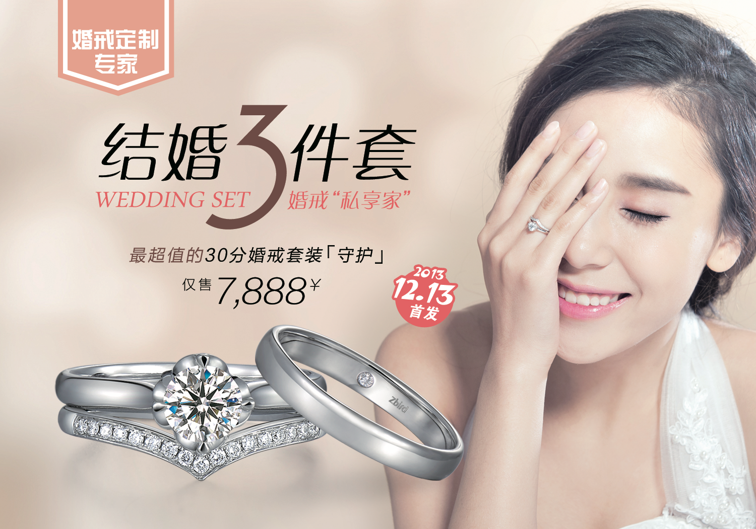 婚戒套裝包含一枚鉆石女戒、一枚男戒、一枚排鉆守護(hù)戒,價(jià)格分為7888元和12888元兩檔,將于2013年12月13日進(jìn)行全國限量發(fā)售。