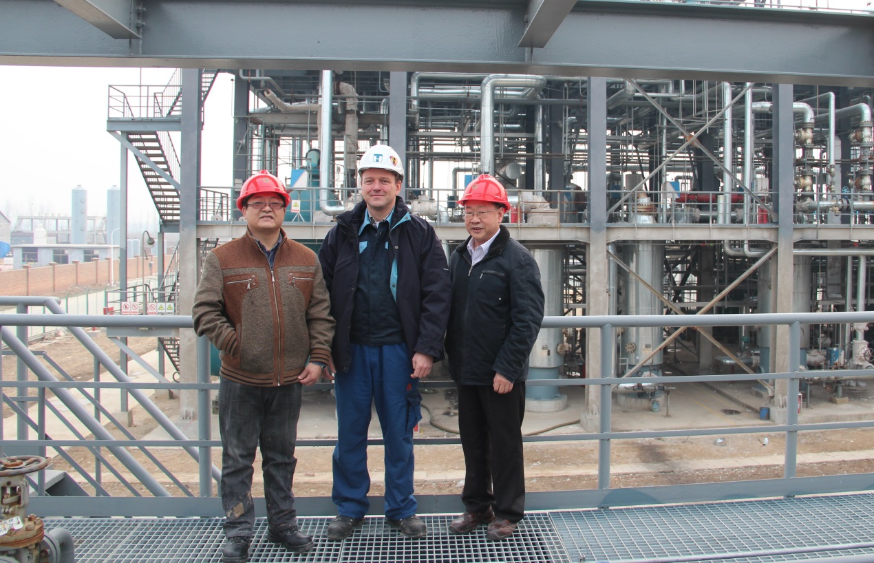 托普索高級工藝工程師Martin Jensen(中)與中海油山東新能源有限公司總工程師劉國軍(左一)和公司總經理姚德彬先生(右一)在甲烷化裝置開車后合影