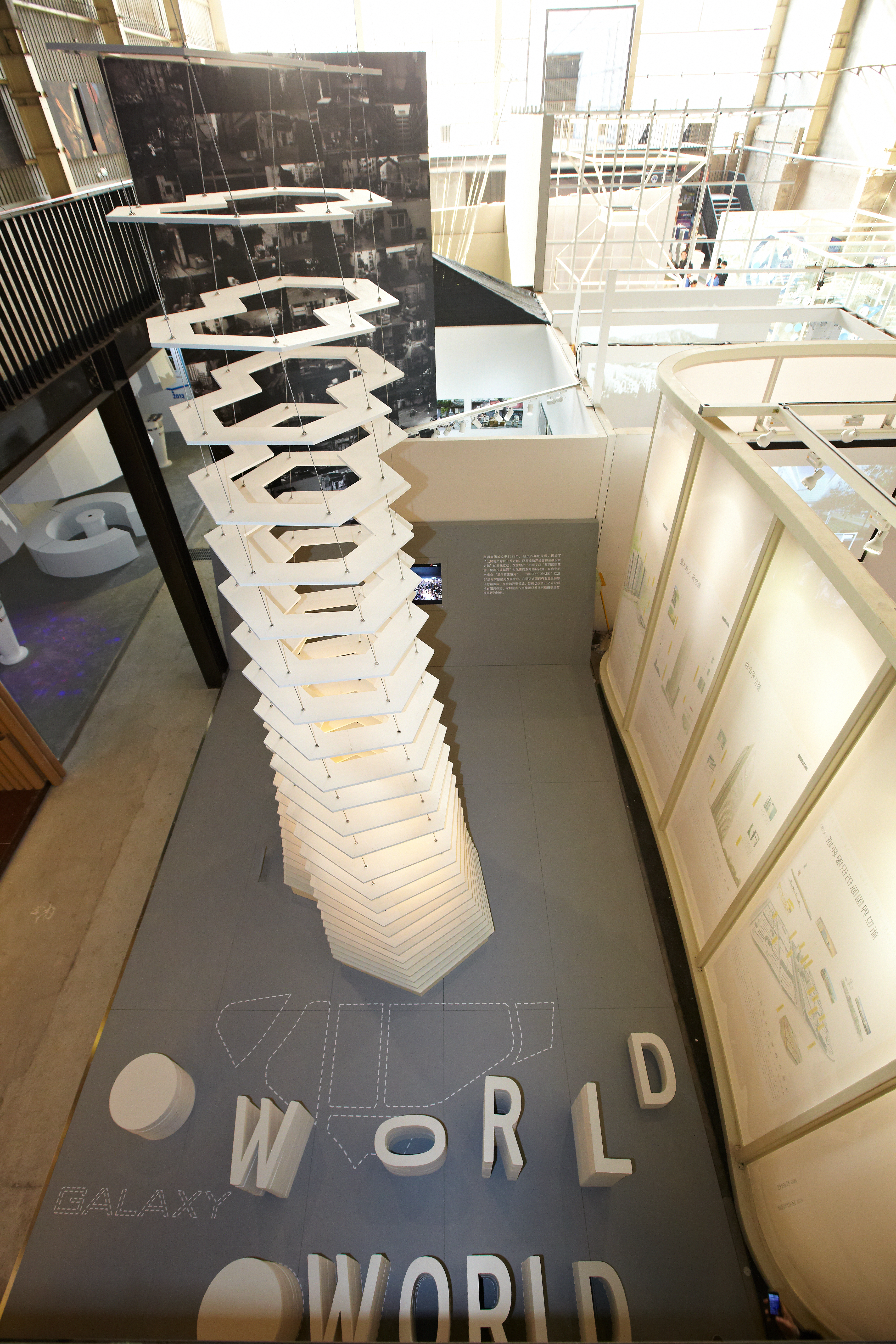 在本屆雙年展中,星河集團通過堆疊星河雙螺絲造型,最終落地成十幾米高的星河塔,雙螺絲造型,意味著穩定的六邊形,類似蜂巢,意味著兢兢業業的團結。它象征了在歲月的積累與能量的匯聚。而這座塔,也象征了文化匯聚的過程:每一個被遺落的邊緣文化,都會因為人們的逐漸關注,慢慢匯聚,從而步入主流成為城市不可或缺的精神養料。